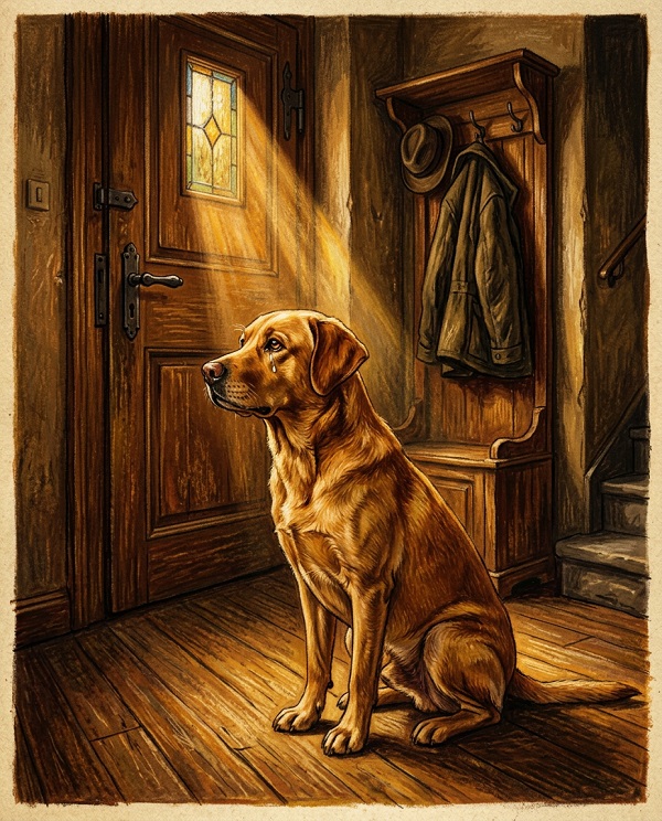Jeden Morgen um halb acht stand Arlo auf, schüttelte sein goldbraunes Fell und lief zur Tür. Nicht weil jemand klingelte. Nicht weil draußen etwas Besonderes passierte. Sondern weil es immer so gewesen war — weil Georg immer um halb acht nach Hause gekommen war, nach seinem Morgenspaziergang mit der Zeitung unter dem Arm und dem leisen Pfiff den nur Arlo kannte.