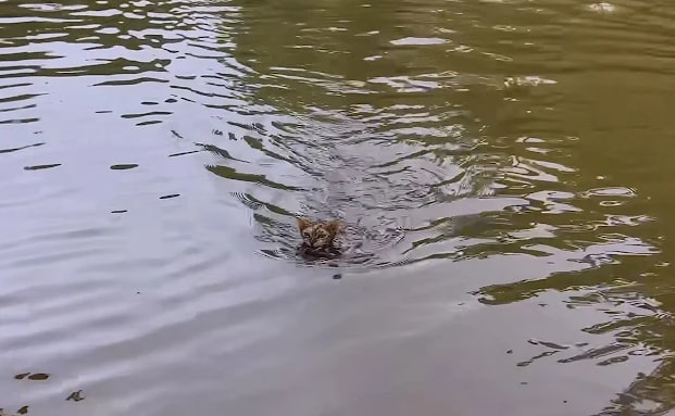 Bella zögerte keinen Moment. Sie packte ihr Baby erneut vorsichtig im Maul, kletterte über eine umgekippte Holztür und sprang ins kalte Wasser.