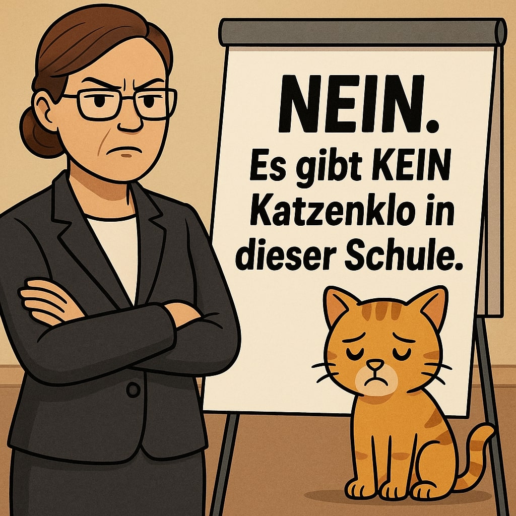 Natürlich nehme man alle Schüler ernst. Auch die, die mal tierische Laune haben. Aber es gäbe so etwas wie… Realität. Und der schulische Auftrag sehe nun mal vor, Menschen aufs Leben vorzubereiten. Nicht auf ein Dasein als Haustier.